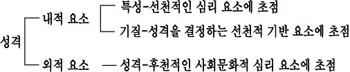 성격(性格)은 한자의 성품 성(性)자와 격식 격(格)자로 이루어져 있다. 그래서 성격이란 내적인 성품이 외적으로 격식을 차리고 있음을 뜻한다. 이는 성격이 내적 요소와 외적 요소로 구성되어 있음을 암시하는 것이다.